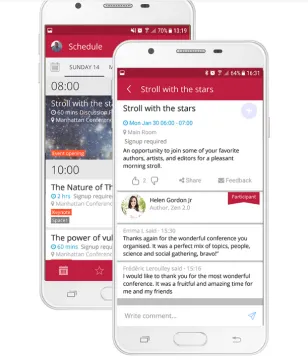 SIEMPRE CONECTADO Puede publicar sus horarios completos en un sitio web de eventos instantáneos de Grenadine, completos con perfiles de oradores, perfiles de asistentes y autoservicio para el registro de artículos. Durante su evento, las aplicaciones móviles de Grenadine (disponibles para teléfonos iOS y Android) permitirán a sus asistentes tener la información completa de su programación, así como las listas de oradores y otra información esencial en su bolsillo.